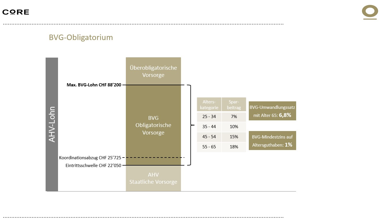 Koordinationsabzug: Da die 1. Säule ein Teil des Lohnes absichert, wird beim BVG-Lohn ein Abzug von CHF 25'725 vorgenommen. Damit wird eine Doppelversicherung des gleichen Lohnanteils vermieden (Koordination von 1. und 2. Säule).