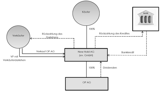 Die Käuferin gründet eine Akquisitionsholding, die alsdann als Käuferin des zu übernehmenden Unternehmens auftritt, womit das Unternehmen zu einer Tochtergesellschaft der Akquisitionsholding wird. Diese Holdinggesellschaft finanziert den Kaufpreis über eine Bankfinanzierung und/oder ein Darlehen des verkaufenden Patrons.