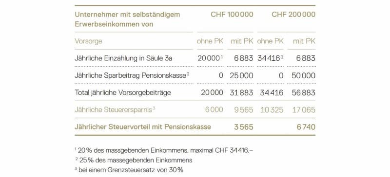 Les avantages liés à une solution avec caisse de pension sont surtout prépondérants pour les revenus élevés. La loi autorise les assurés à verser des cotisations d'épargne jusqu'à environ 25% du salaire AVS annuel.
