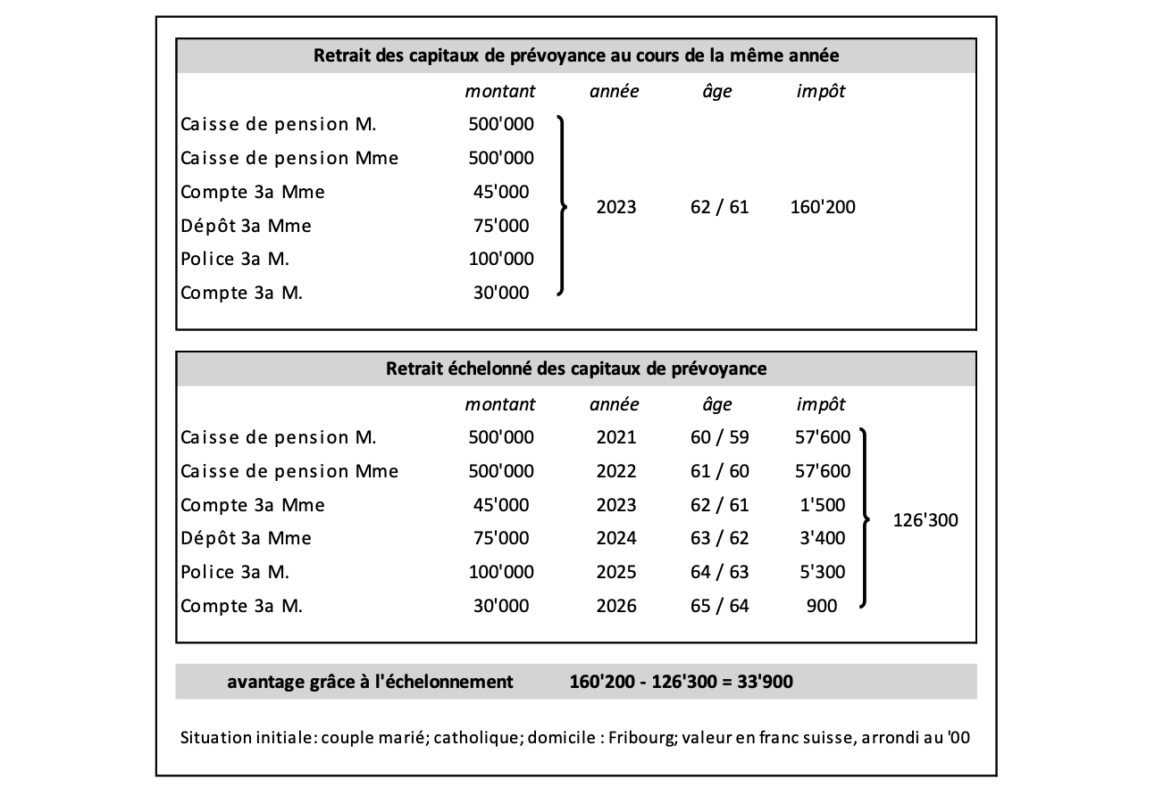 Au moment du retrait des capitaux, un impôt sur le versement de capital de prévoyance est déclenché (identique au 2ème pilier). Le taux d’imposition dépend du montant de la prestation versée. Dû à l’évolution progressive du taux d’imposition, plus le montant versé est grand, plus la charge fiscale sera élevée. Cela fait donc sens, d’organiser le retrait des capitaux de prévoyance de manière échelonnée sur différentes périodes fiscales (cf. tableau ci-dessous). Il s’agit de coordonner le retrait des capitaux du pilier 3a (compte, dépôt, police d’assurance) avec ceux du 2ème pilier (caisse de pension, libre passage).