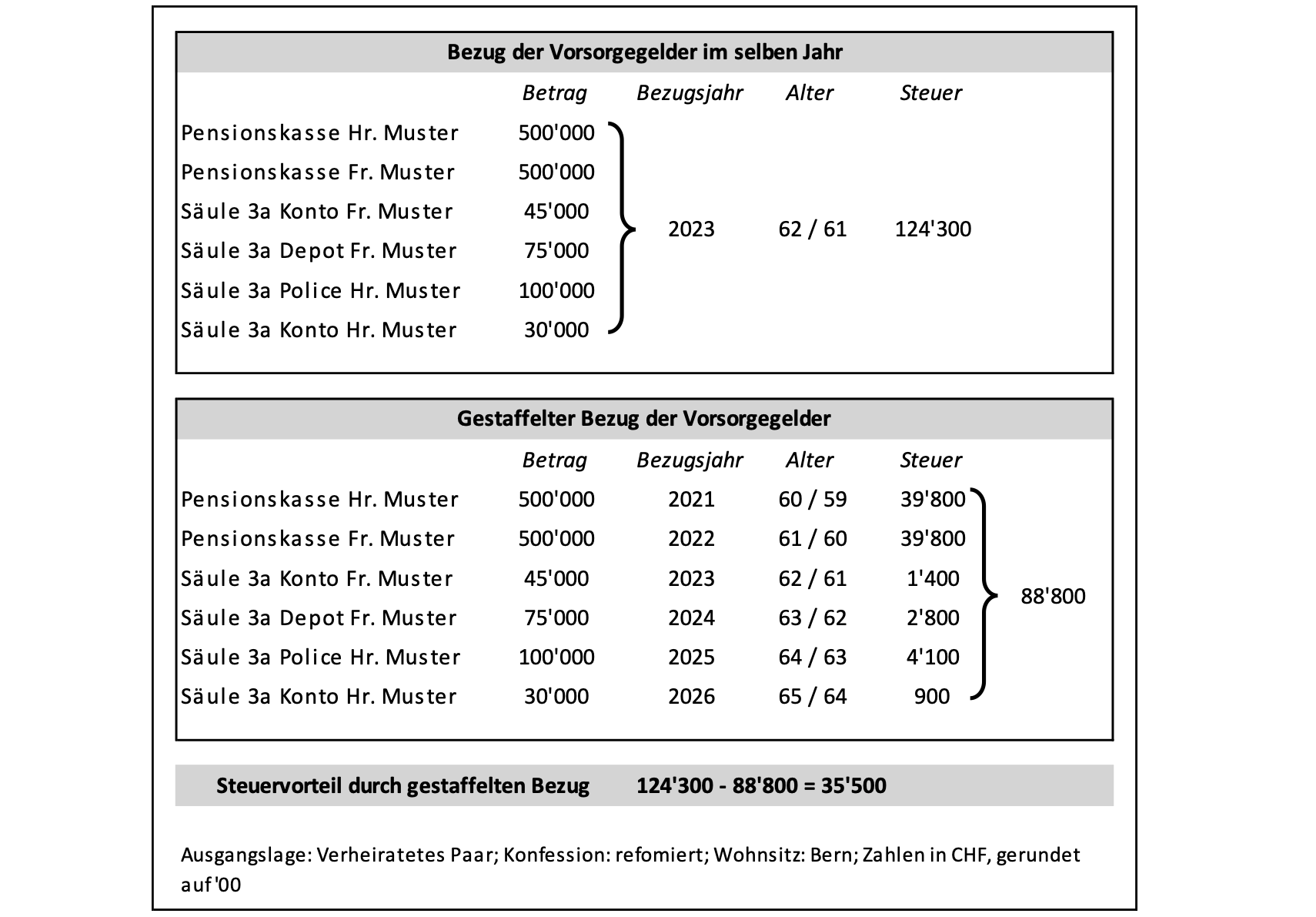 When the 3a assets are withdrawn, the capital is subject to a capital payment tax (analogous to the 2nd pillar). The amount of the capital payment tax depends on the amount paid out. Due to the progressive tax rate, the larger the amount, the greater the tax burden. Therefore, the withdrawal of pension assets should be staggered over different tax periods. It is important to coordinate the withdrawal of the 3a assets (account, securities deposit, insurance policy) with the withdrawal from the 2nd pillar (pension fund, vested benefits) (see table below).