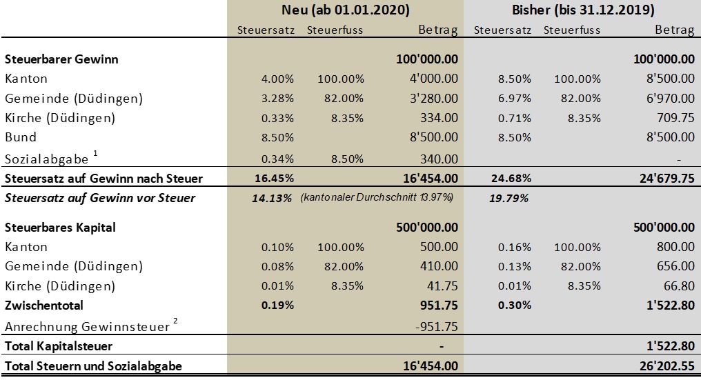 Im vorliegenden Beispiel wird ersichtlich, dass die Unternehmenssteuerreform zu einer deutlichen Senkung der Gewinnsteuern führt. Die neu eingeführte Sozialabgabe fällt hier mit CHF 340.00 kaum ins Gewicht.